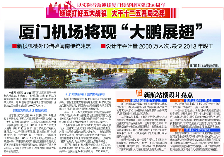 厦门机场将再新增一座标志性建筑。记者昨日了解到,厦门机场T4航站楼建筑方案设计已经敲定。根据方案,运用闽南传统建筑元素设计的T4航站楼未来将成为国内航站楼,设计旅客吞吐量有望达到2000万人次/年。