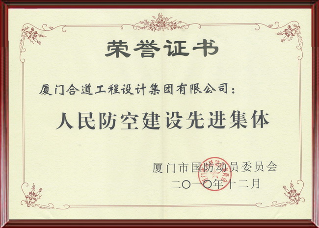 鉴于我司(厦门合道工程设计集团有限公司)为厦门市人民防空建设所做出的积极贡献,厦门市国防动员委员会授予我司“十一五”期间“厦门市人民防空建设先进集体”的荣誉称号。