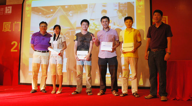 紧接着,联欢活动正式开始。活动分为“中秋博饼”和“中秋晚宴”两大主题进行。在极具闽南地方特色的博饼活动中,现场掷骰子的叮当声、员工的惊叹声、喝彩声不绝于耳,联欢现场热闹非凡…… 活动现场来宾及员工560多人,先经过每桌初级PK,博出每桌“状元”共56名,状元们依次上台分四组进行状元“王中王”终极对决,最终四个状元“王中王”大奖(ipad2平板电脑)分别被土建一院、土建三院、土建五院和建筑专业院的四名状元夺得。