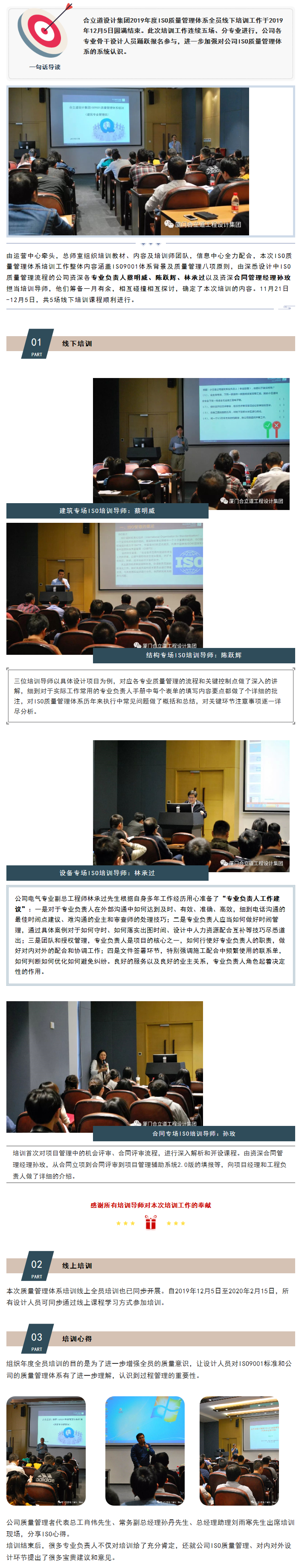合立道培训丨2019年ISO质量管理体系培训工作简讯 【发布时间:2019-12-19】 【浏览次数:7852次】 【字体:大 中 小】 【颜色:红 绿 蓝 黑】 【上一条】:合立道协办丨2025年福建省工程建设信息化学术年会在合立道大厦圆满举办!【下一条】:12月,荣耀时刻,与您共鉴!