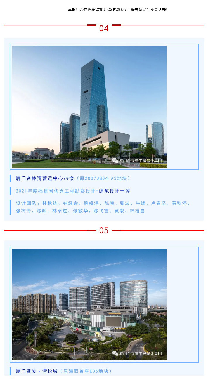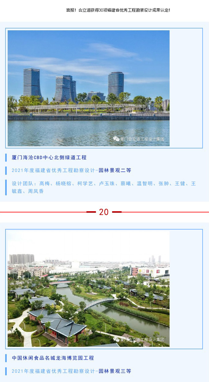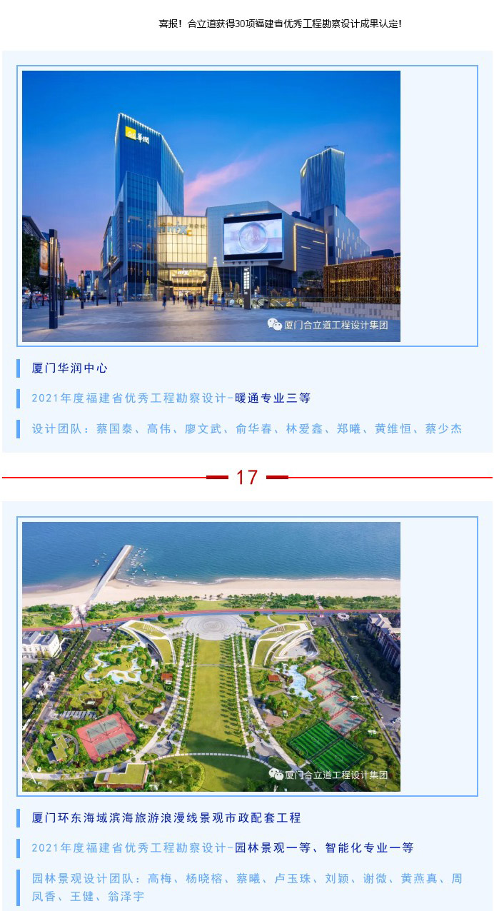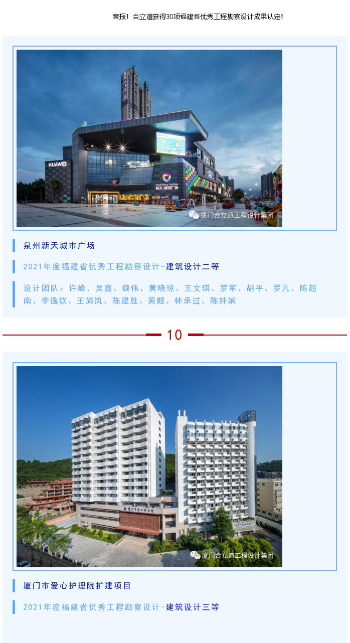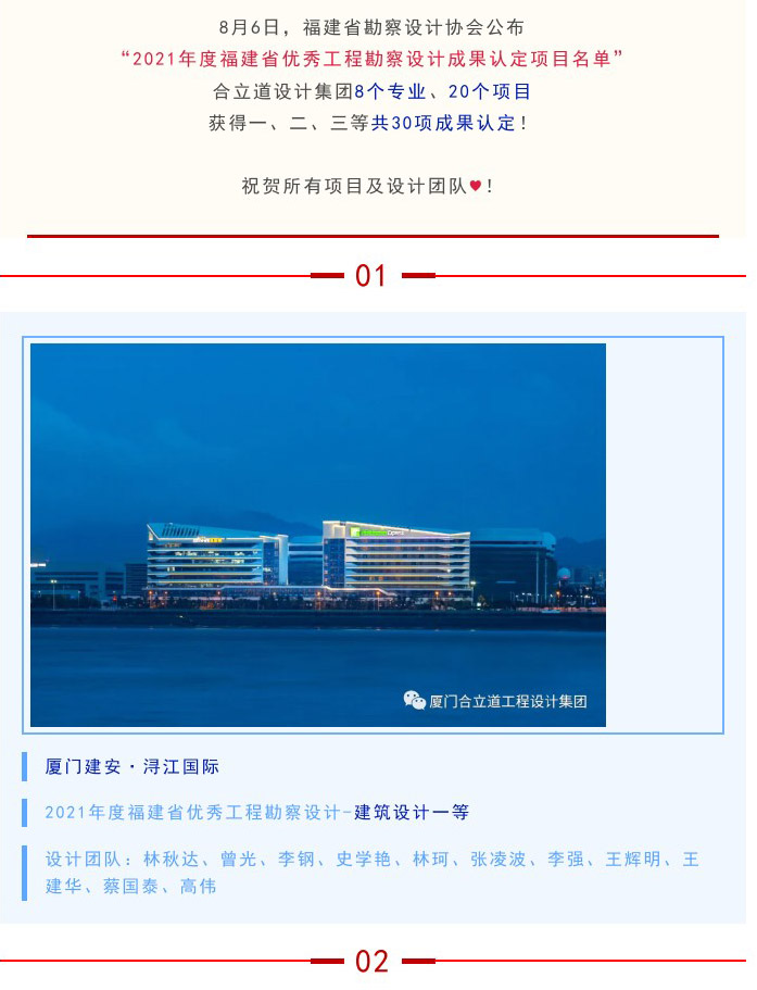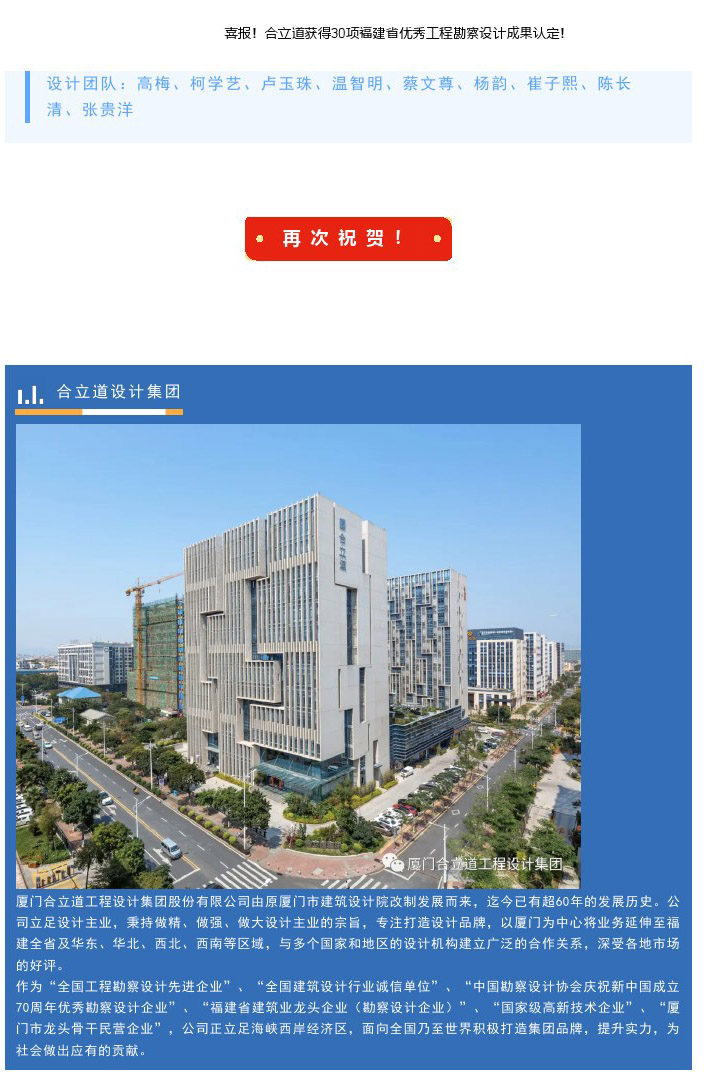 喜报!合立道获得30项福建省优秀工程勘察设计成果认定! 【发布时间:2021-08-09】 【浏览次数:10822次】 【字体:大 中 小】 【颜色:红 绿 蓝 黑】 【上一条】:合立道协办丨2025年福建省工程建设信息化学术年会在合立道大厦圆满举办!【下一条】:合立道设计-厦门首个完成装配式评价的钢结构项目即将投用!
