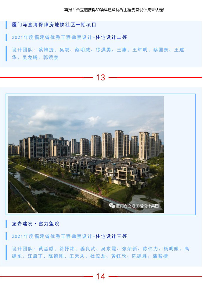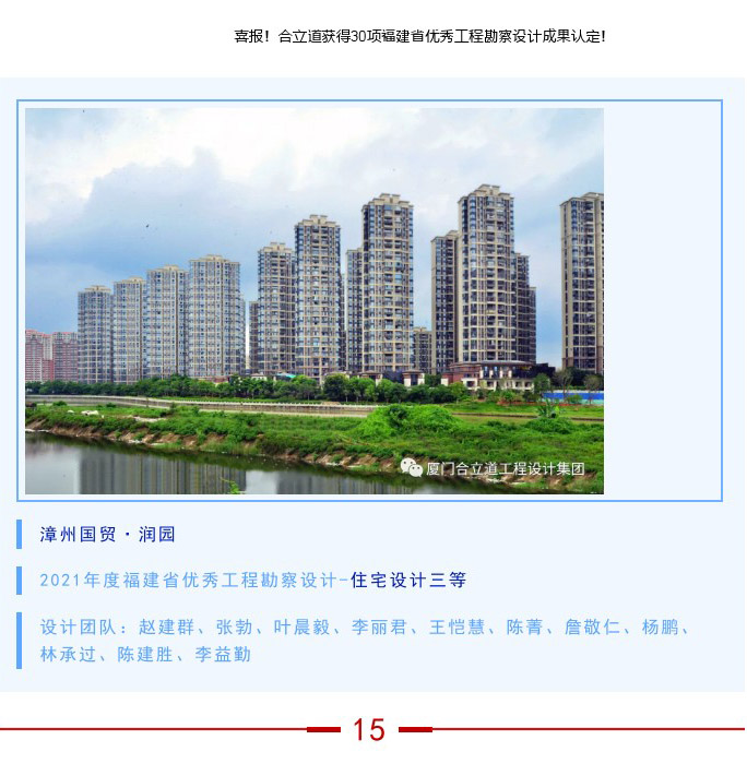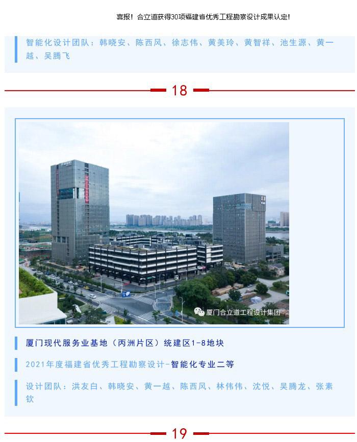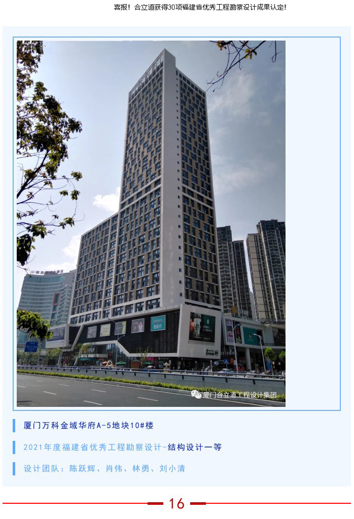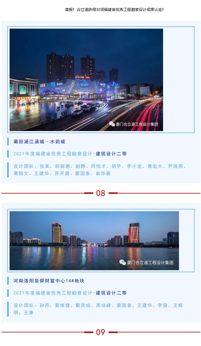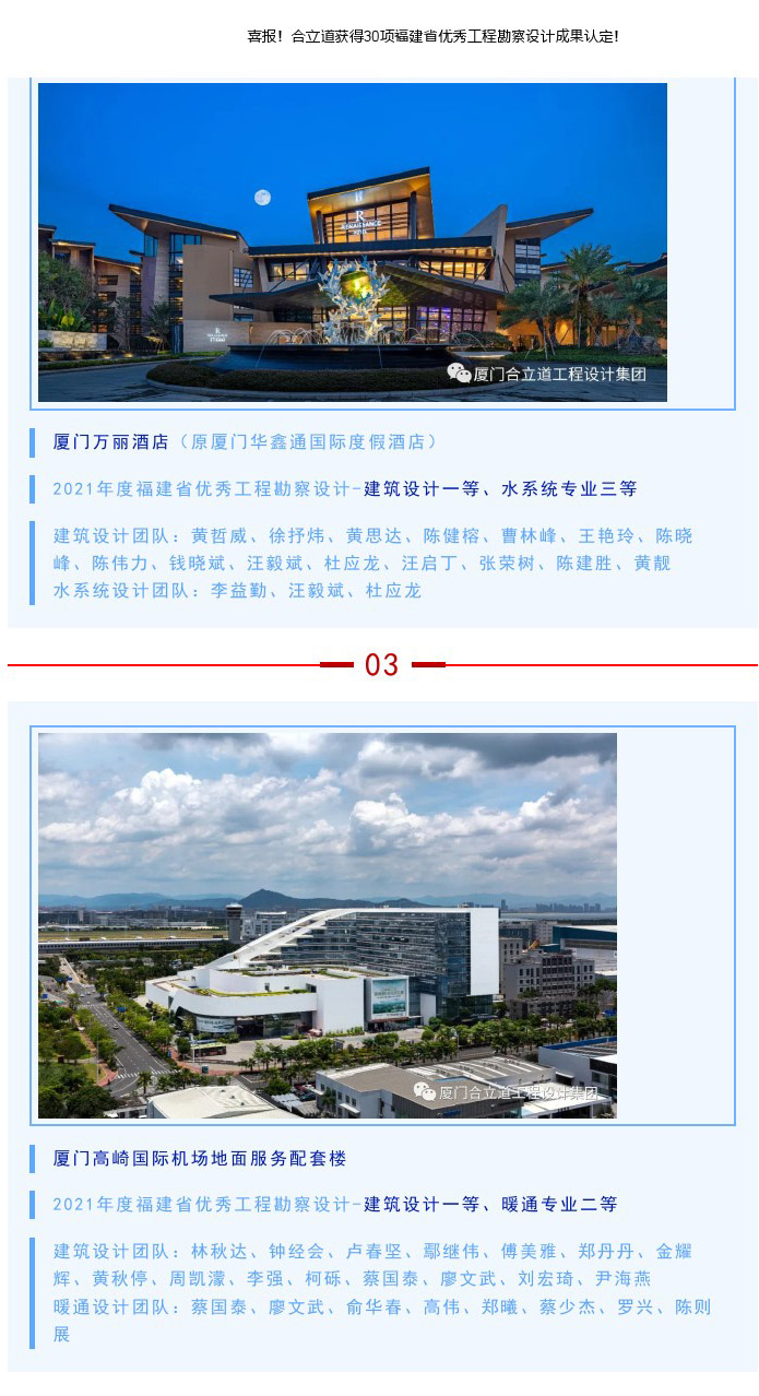 喜报!合立道获得30项福建省优秀工程勘察设计成果认定! 【发布时间:2021-08-09】 【浏览次数:10822次】 【字体:大 中 小】 【颜色:红 绿 蓝 黑】 【上一条】:合立道协办丨2025年福建省工程建设信息化学术年会在合立道大厦圆满举办!【下一条】:合立道设计-厦门首个完成装配式评价的钢结构项目即将投用!