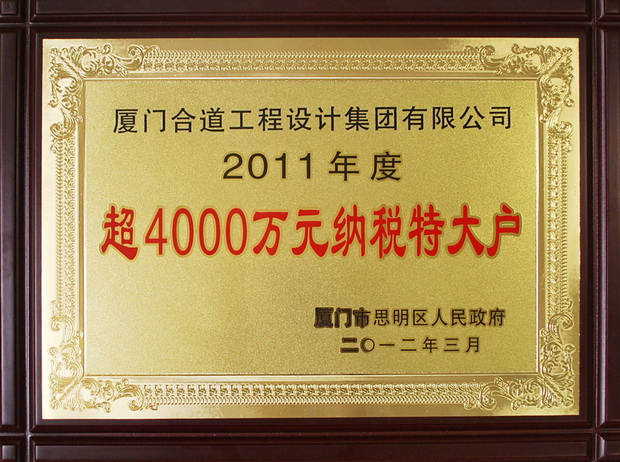 热烈祝贺我司荣获“超4000万元纳税特大户”称号 【发布时间:2012-03-26】 【浏览次数:14019次】 【字体:大 中 小】 【颜色:红 绿 蓝 黑】 热烈祝贺我司荣获由中共思明区委员会、思明区人民政府授予的“2011年度超4000万元纳税特大户”荣誉称号。我司将再接再厉,为企业发展、经济进步做出更大的努力。 【上一条】:合立道协办丨2025年福建省工程建设信息化学术年会在合立道大厦圆满举办!【下一条】:我司给水排水专业沙龙活动在德化顺利开展