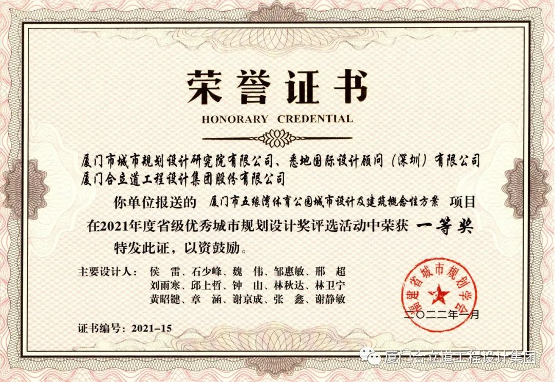 喜报 | 合立道设计集团参与设计项目荣获“省级优秀城市规划设计一等奖” 【发布时间:2022-06-14】 【浏览次数:18305次】 【字体:大 中 小】 【颜色:红 绿 蓝 黑】 合立道设计集团参与设计的“厦门市五缘湾体育公园城市设计及建筑概念性方案”项目在福建省城市规划学会年度省级优秀城市规划设计奖评选活动中荣获一等奖。 【上一条】:合立道协办丨2025年福建省工程建设信息化学术年会在合立道大厦圆满举办!【下一条】:校企合作 | 合立道设计集团和华侨大学、厦门理工学院本科生毕业设计总结交流会顺利举行
