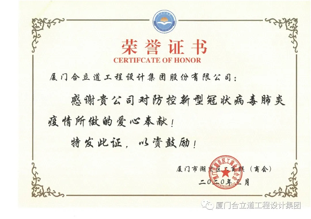 湖里区工商联(商会)颁发爱心证书和感谢信,感谢合立道在有序推动复工复产的同时,积极响应湖里区工商联(商会)的倡议,紧急施援,主动捐款捐物,奉献爱心。