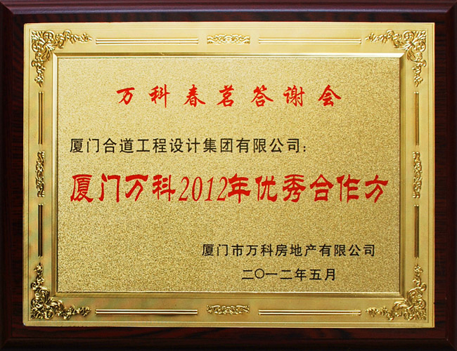 喜 报 【发布时间:2012-07-05】 【浏览次数:14521次】 【字体:大 中 小】 【颜色:红 绿 蓝 黑】 鉴于土建一院、设备二所、结构专业院在“万科金域华府A-5地块”项目中的优秀表现,厦门市万科房地产有限公司授予我司“厦门万科2012年优秀合作方”荣誉称号。 在此,对“万科金域华府A-5地块”项目组表示热烈祝贺!望我司设计团队再接再厉,以更加优秀的设计和优质的服务争取优异的成绩。 【上一条】:合立道协办丨2025年福建省工程建设信息化学术年会在合立道大厦圆满举办!【下一条】:我司参加第九届厦门人居展现场集锦