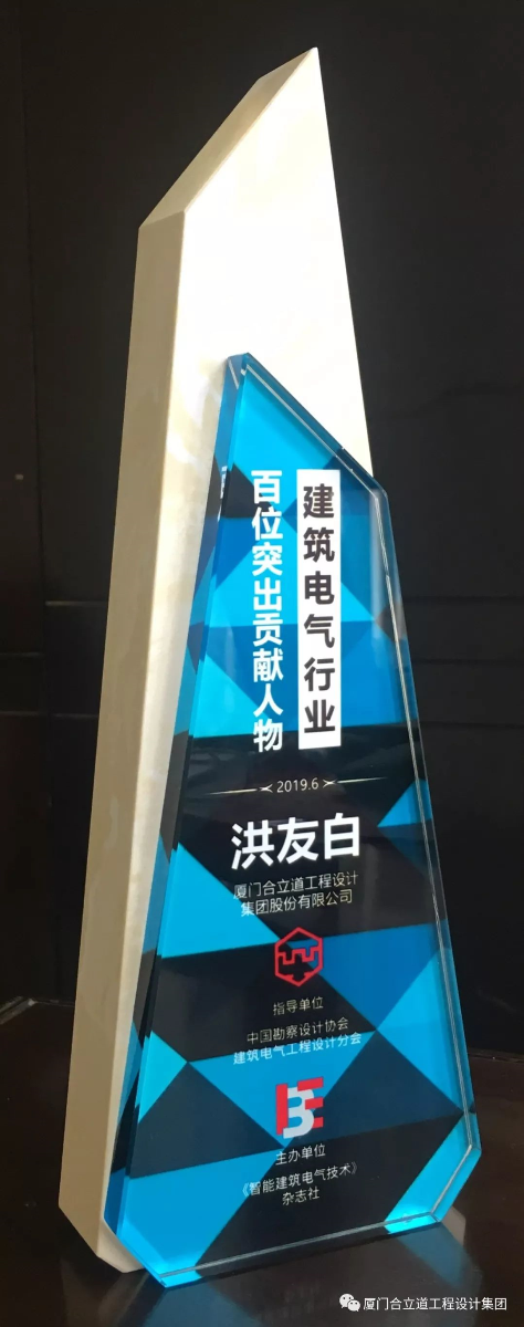 2019年6月28日,中国勘察设计协会建筑电气分会指导评选的“建筑电气行业百位突出贡献人物”颁奖典礼在江苏无锡隆重举办。合立道工程设计集团电气及智能化总工程师洪友白先生荣膺“建筑电气行业百位突出贡献人物”称号。